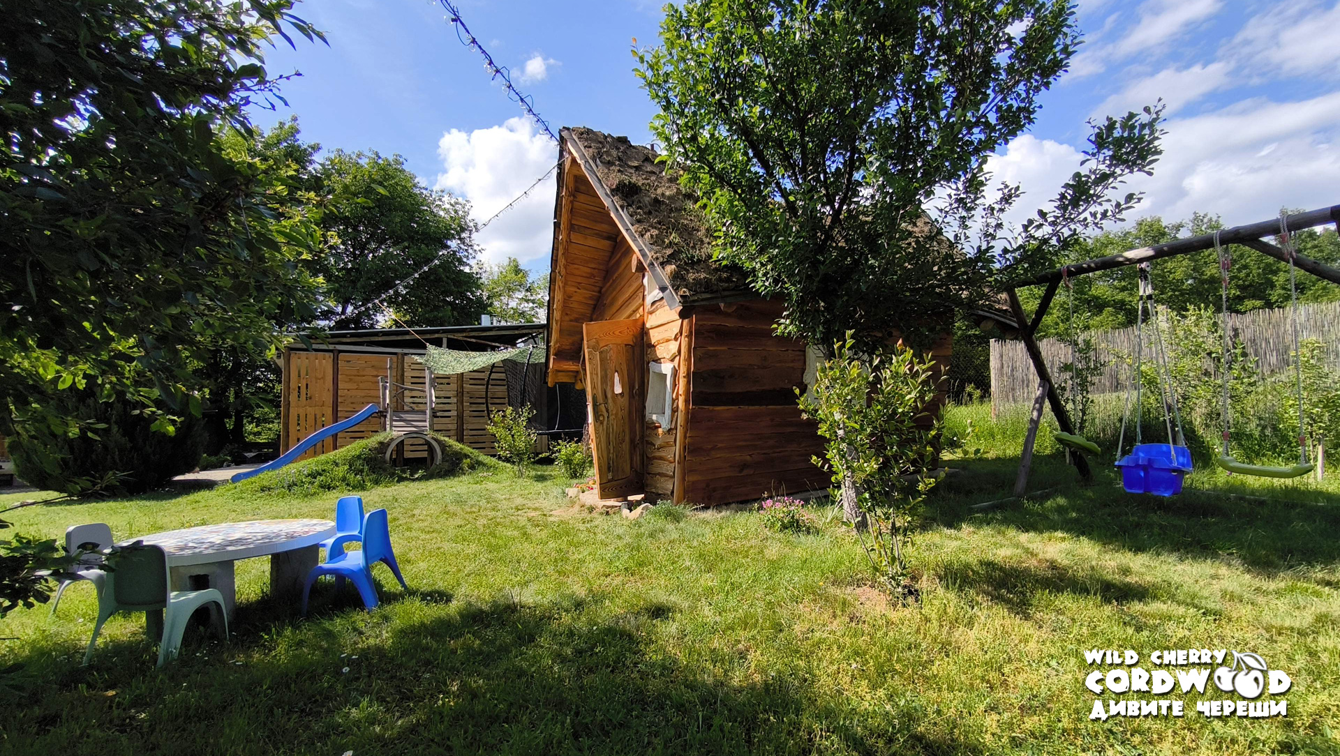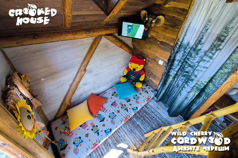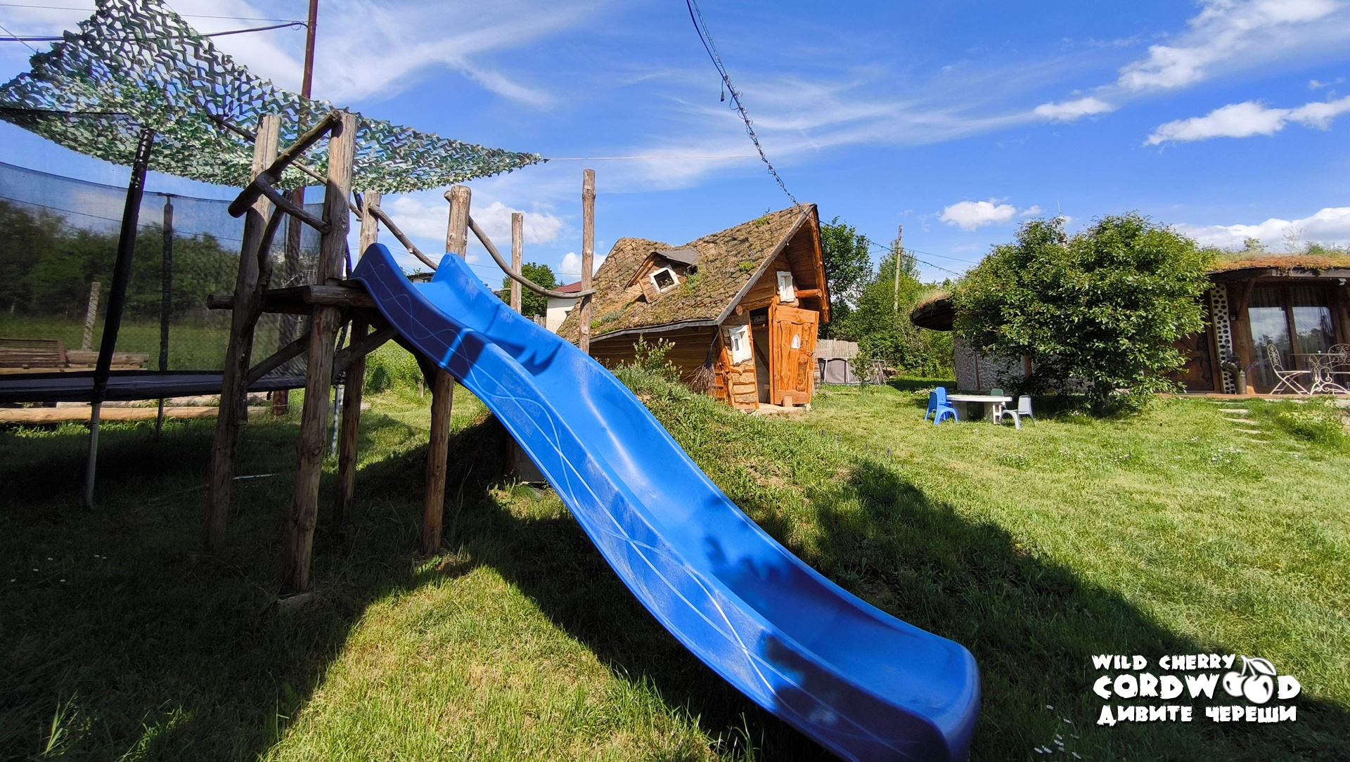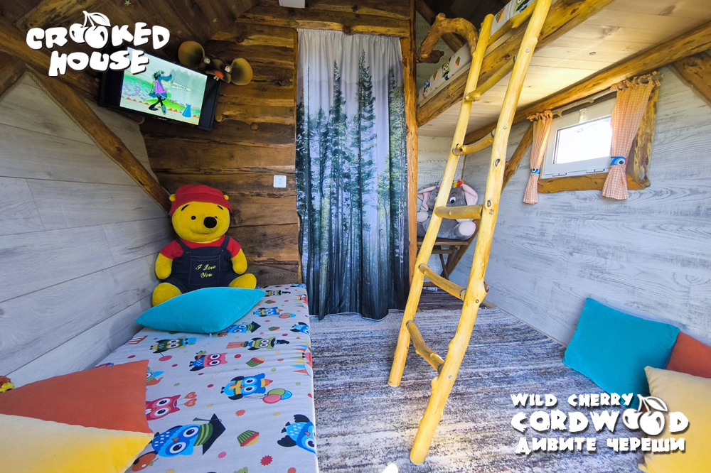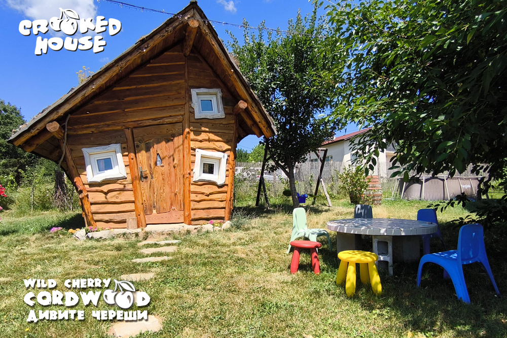 Кривата къщичка е част от детската зона на къща за гости „Дивите череши“, където всяко дете открива своя малък, вълшебен свят – с люлки, пързалка, батут и безкрайни възможности за игра.